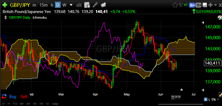 En el gráfico diario, sin embargo, vemos una buena recuperación de la 137, donde el par GBP/JPY pude cruzar a través de la nube. Mientras tanto, el par de divisas se nota algo debajo. A pesar de los resultados de precio fuerte, el 'cable' en el balance prácticamente ningún progreso hay desde el comienzo de este año. Las medias móviles Tenkan-Sen (9 Periodos / línea roja) y la Kinjun-Sen (26 veces / línea azul) tienen la grafico diario sin embargo, se muestra un cruce negativo. La "nube" (aquí, la nube de color amarillo) puede causar la resistencia entre 142 y 143.